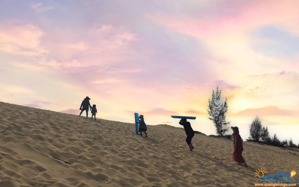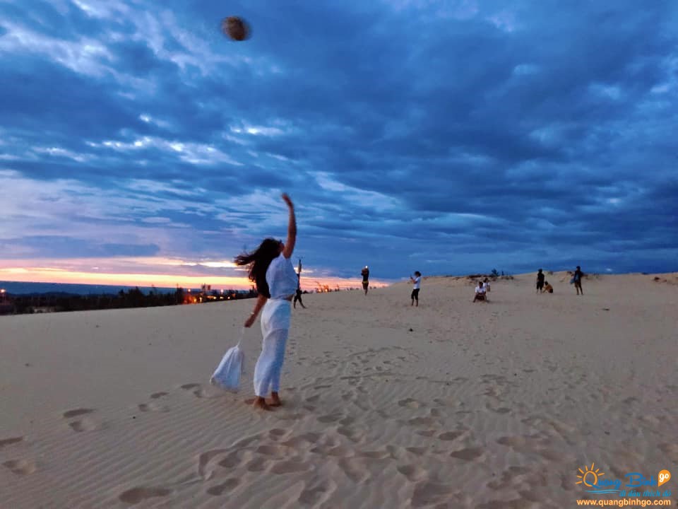 Bên trên, là bầu trời trong xanh. Bên dưới, là những triền cát trắng nối dài, ngút tầm mắt. Tạo nên một quang cảnh tuyệt đẹp. Các bạn có thể dạo chơi, vui đùa trên cát, và thả hồn mình vào với thiên nhiên đất trời. Một số bạn trẻ, có thể tham gia trò trượt rất thú vị; và hấp dẫn. Từ trên các đồi cát cao, với một tấm ván trượt, các bạn sẽ lướt trên nền cát trắng mịn màng. Một cảm giác rất vui; và thích thú như được tìm về với tuổi thơ, với những trò chơi tinh nghịch.