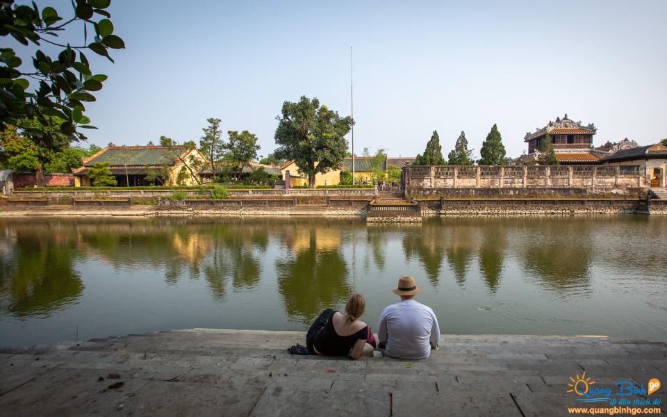 Đến tham quan Hoàng Thành (Ðại Nội): Nằm ở khoảng giữa kinh thành là nơi đặt các cơ quan cao nhất của chế độ quân chủ và là nơi thờ tự các vua chúa đã quá cố. Hoàng Thành có mặt bằng gần vuông, mỗi bề khoảng 600m, xây bằng gạch, cao 4m, dày 1m, xung quanh có hào bảo vệ, có 4 cửa để ra vào, trong đó cửa Ngọ Môn chỉ dành để cho vua đi. Đại Nội được chia ra nhiều khu vực: