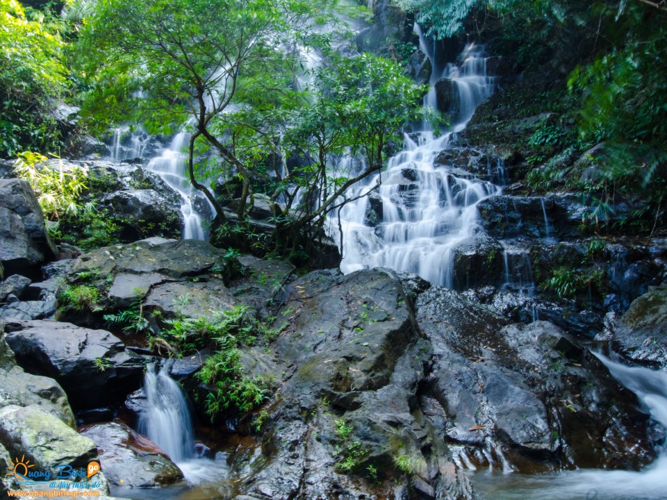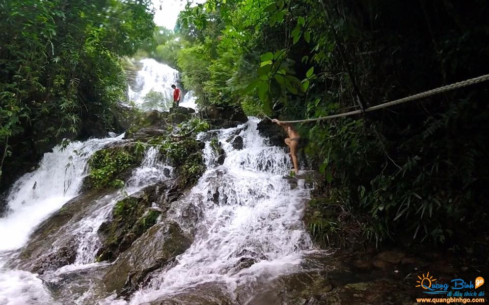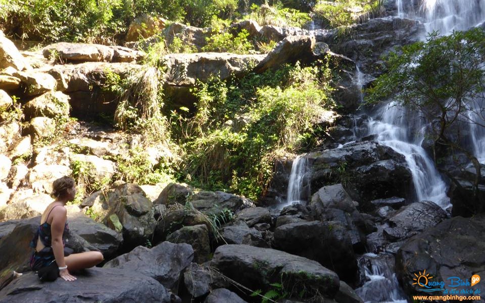 Ngắm thác Gió, nước chảy từ trên thác cao xuống, bọt tung trắng xóa; trong nền màu xanh của núi rừng là một cảnh tượng hùng vĩ; nên thơ giữa núi rừng Phong Nha.