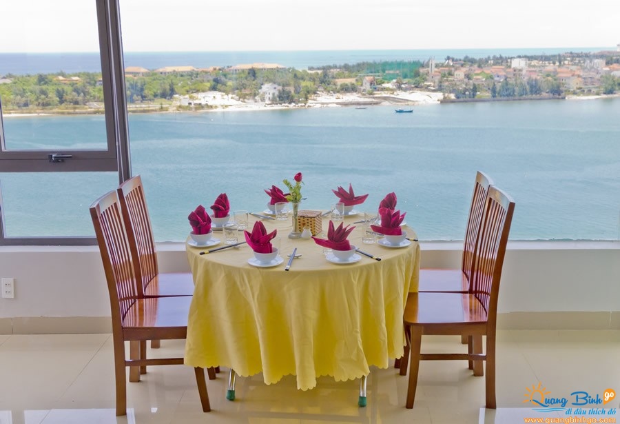 Đến đây, Quý khách được tận mắt nhìn ngắm sông – biển Nhật Lệ; và toàn cảnh TP. Đồng Hới từ trên cao. Từ lúc bình minh ló dạng trên biển Đông; cho đến khi mặt trời tắt nắng sau dãy núi Trường Sơn bao la; và hùng vĩ. Khi màn đêm buông xuống; từ cửa sổ các phòng; hay từ Skybar tầng 14 của khách sạn. Quý khách được thưởng lãm đêm Đồng Hới lung linh, huyền ảo bên dòng sông Nhật Lệ.
