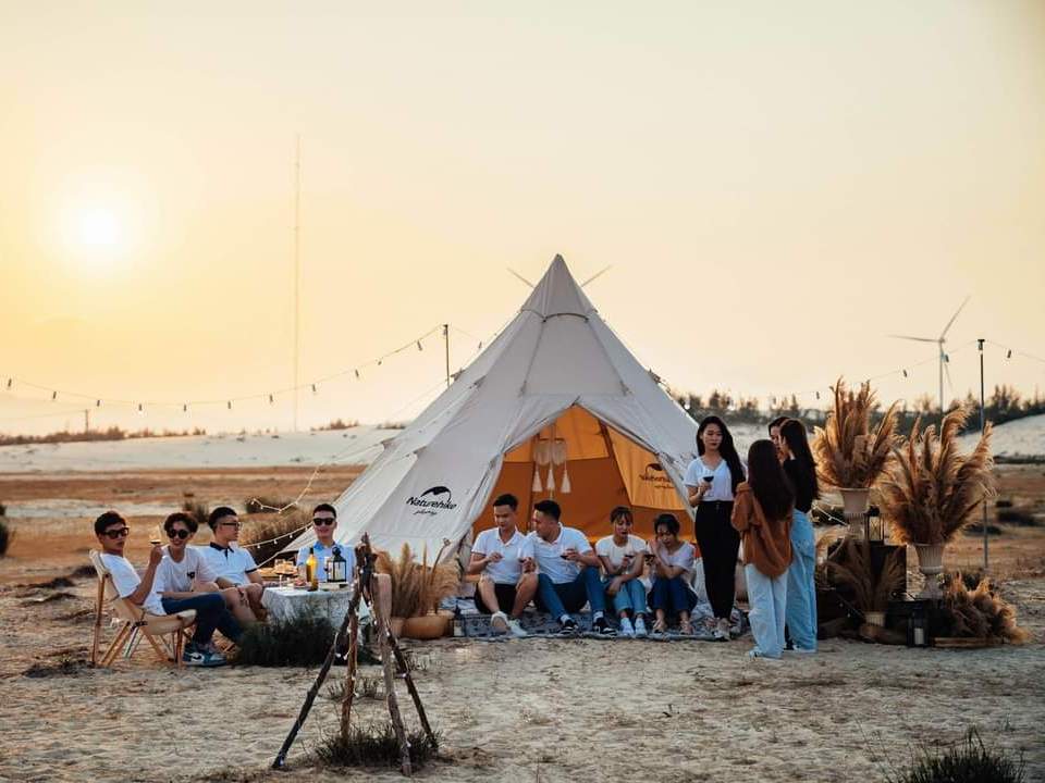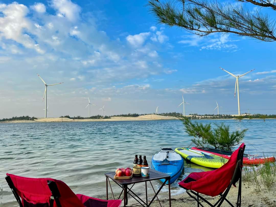 Một trong những hoạt động thú vị đó là cắm trại trên cánh đồng điện gió. Bãi cát trắng là địa điểm tuyệt vời để dựng lều trại. Trải nghiệm các hoạt động và ngắm cảnh hoàng hôn. Hay cùng nhau đón ánh bình minh trên cánh đồng điện gió Quảng Bình. Chính là khung cảnh mà chắc chắn bạn sẽ mong muốn được một lần trải qua.