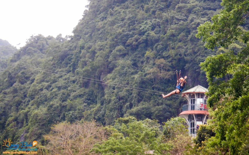 Sau khi HDV mua vé, Quý khách làm các thủ tục như: ký giấy cam kết, thay trang phục. Mang áo phao, dây đai để đu dây Zipline, và đội nón có đèn pin đội đầu. Đến trạm Zipline bắt đầu đu dây dài 400m vào đến cửa động, bắt đầu khám phá Hang Tối.